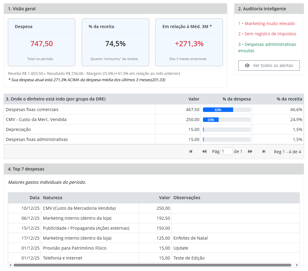 Visualize seus números, identifique alertas e tome decisões com mais segurança, mesmo sem ser especialista em finanças.